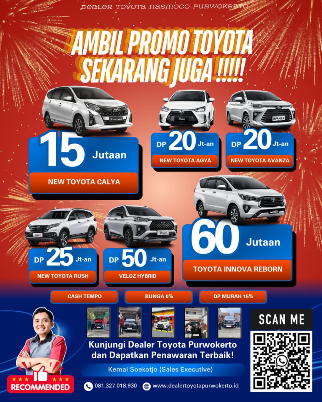 Perkenalkan saya Kemal Soekotjo seorang Sales Executive Dealer Resmi Toyota Purwokerto (Nasmoco Group). Saya akan membantu Anda dalam memiliki kendaraan Toyota dalam bentuk: konsultasi menentukan produk Toyota yang sesuai dengan kebutuhan, konsultasi pembelian cash/credit yang sesuai dan cocok dengan dana yang dimiliki, memberikan paket promo terbaik, test drive kendaraan, layanan service seperti booking service, klaim dan daftar asuransi kendaraan, dan lain sebagainya. Ada yang ingin ditanyakan? Hubungi kontak saya di website ini.